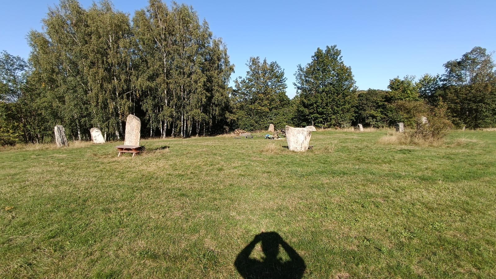Przechodząc trochę na bok, przez łąkę, dochodzimy do dużego w średnicy kamiennego kręgu, który dzisiaj w ponad jednej trzeciej znajduje się w wyrosłych z biegiem lat brzózkach.